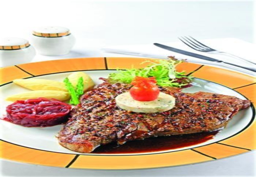 Trang trí: Sắp thịt ra đĩa cùng với hành tây nấu rượu, khoai tây nghiền, măng tây, xà lách, cà chua bi, trang trí cho đẹp mắt.