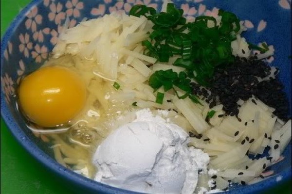 Cho trứng gà, khoai tây, hành, tiêu, vừng đen, bột mì vào một tô to rồi trộn cho thật đều.