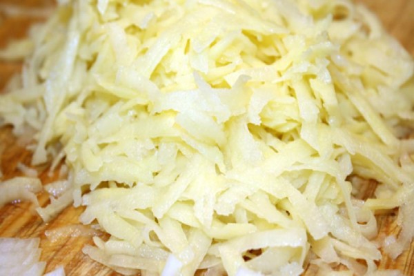 Khoai tây các bạn gọt vỏ rửa sạch, sau đó bào sợi, đem trụng nước sôi khoảng 2-3 phút, vớt lên vắt ráo.