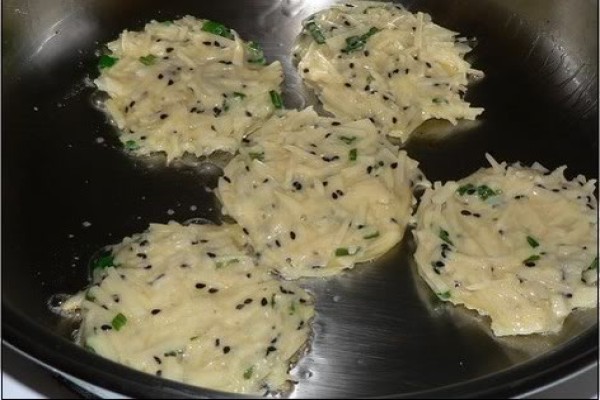 Làm nóng chảo cùng hai thìa canh dầu ăn. Tiếp đó, múc hỗn hợp đổ vào chảo thành từng miếng chả tròn, dàn mỏng. Chiên cả hai mặt cho đến khi chả có màu nâu vàng là được,