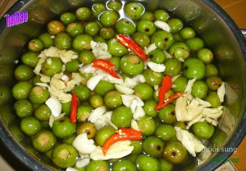 Sung bỏ cuống, ngâm trong chậu nước có pha dấm loãng, để qua một đêm (khi muối sung sẽ trắng, không bị thâm).