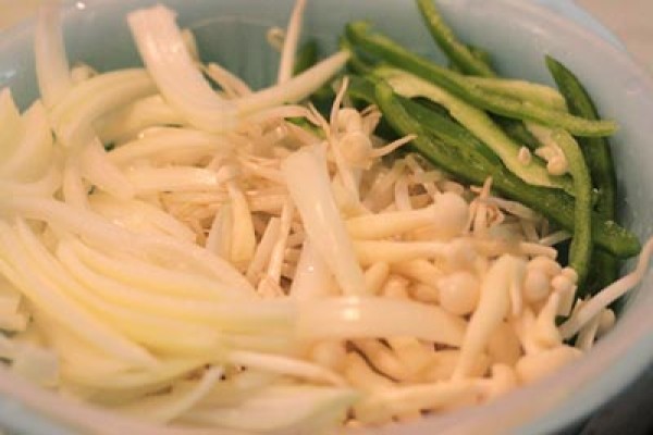 - Nấm cắt bỏ chân, rửa sạch, để ráo. Hành tây bóc bỏ vỏ khô bên ngoài, thái mỏng. Giá rửa sạch, để ráo. Ớt chuông xanh bỏ hạt, thái sợi. Bạn có thể chuẩn bị sẵn các nguyên liệu, để thời gian chế biến nhanh hơn.