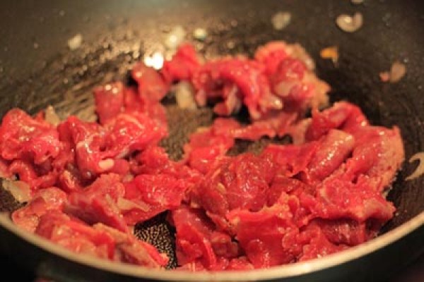 - Đun nóng ba thìa nhỏ dầu ăn, phi tỏi thơm, cho thịt bò vào xào nhanh tay lửa lớn, thịt chín vớt ra đĩa để riêng.