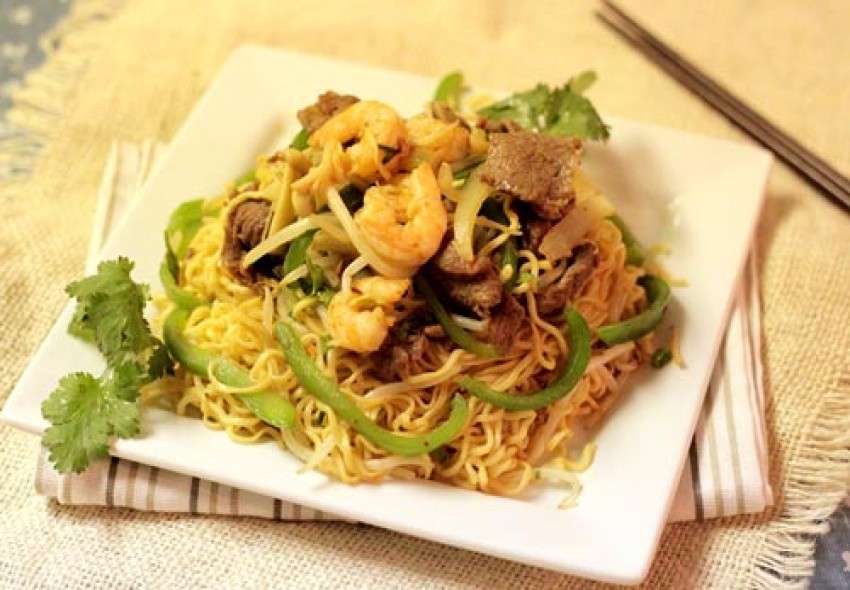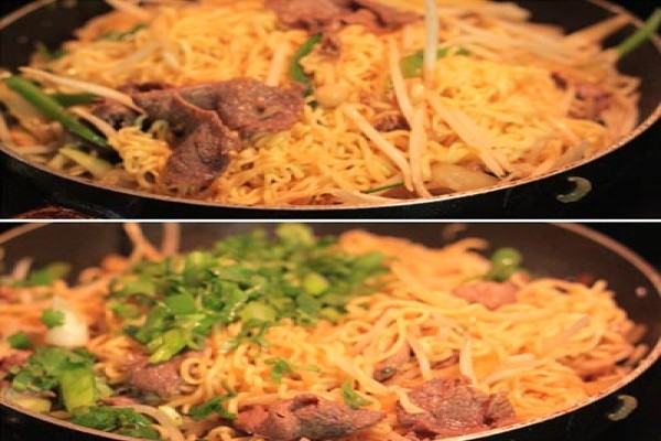 - Cuối cùng cho thịt bò, tôm và mỳ tôm vào xào, đảo đều và nhanh tay, nêm nếm lại gia vị cho vừa ăn. Xào đến khi thịt bò, mỳ tôm quyện lẫn với các loại rau củ, không xào lâu nếu không thịt bò dai. Tắt bếp, thêm hành lá, rau mùi thái nhỏ, múc ra đĩa dùng nóng, có thể rưới một xì dầu pha với ớt lên bề mặt sợi mỳ.