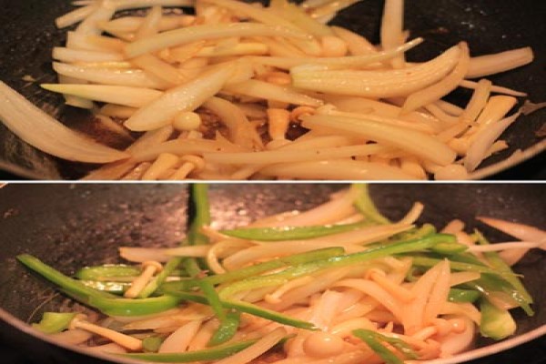 - Xào hành tây cho thơm, cho nấm, ớt chuông vào xào cùng, rưới vào một ít dầu hào, hạt tiêu. Xào tiếp từ 3 đến 5 phút.
