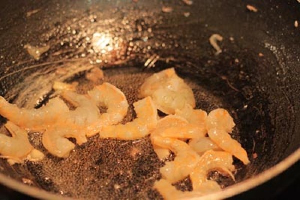 - Dùng lại chảo đó, cho tôm vào xào chín, vớt ra đĩa để chung với thịt bò.