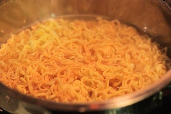- Đun nồi nước sôi, cho mỳ vào chân sơ từ 2 đến 3 phút, sợi mỳ chín, đổ ra rổ cho ráo nước.