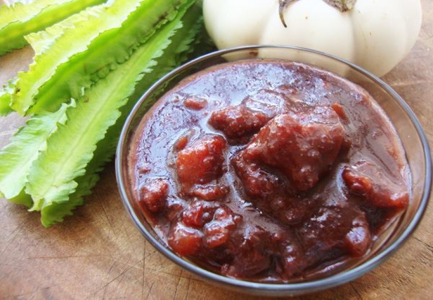 Tắt bếp múc ra đĩa, mắm ruốc xào ăn kèm cà bát, đậu rồng, cà chua rất ngon.