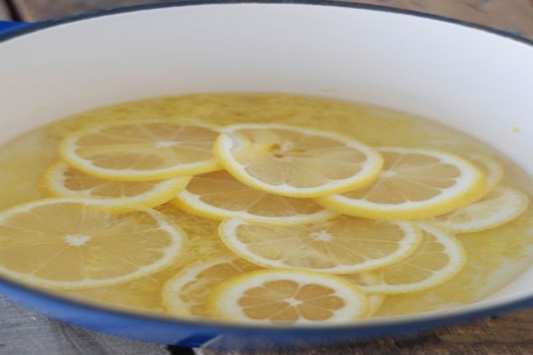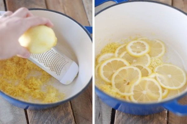 Bào vỏ và vắt lấy nước cốt của 3 quả chanh vào một cái nồi nhỏ. Quả chanh còn lại thì cắt lát mỏng và cho chung vào nồi (bạn nhớ bỏ hạt chanh đi nhé).