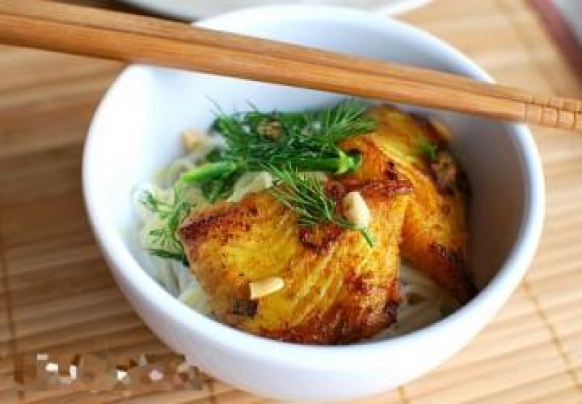 - 5Bày cá trên đĩa đã lót sẵn hành, thì là phi chín. Rắc một ít hành hoa tươi lên cho bắt mắt. Tiếp tục cho đậu phộng lên trên và thưởng thức khi còn ấm với nước chấm. Món này ngon tương đương với chả cá lã vọng nổi tiếng đấy nhé các bạn!