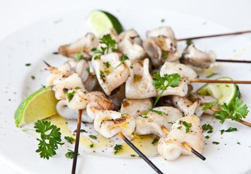Dùng chổi phết dầu phết 1 lớp mỏng dầu olive lên hai mặt của mực, rắc mùi băm lên, ăn cùng chanh và tương ớt.