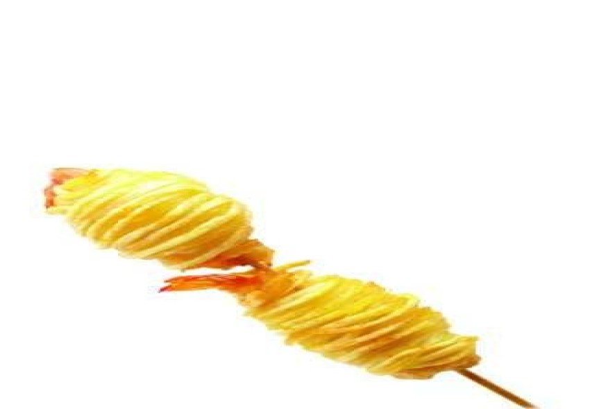 Quấn các sợi khoai vòng quanh con tôm cho tròn đều rồi xiên vào que tre.